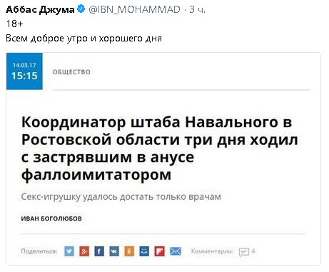Но вы же, навальновские адепты, сами про себя всё рассказываете в своих переписках. Это вас с фаллоиммитаторами в разных дырах врачи спасают и ваши же либерасьи СМИ пишут.
