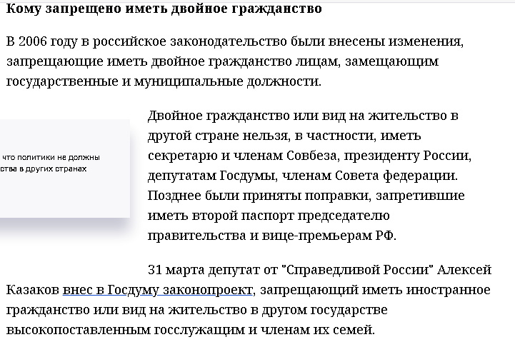 С 2006 г. запрещено иметь двойное гражданство госслужащим и депутатам. В этом году закрепили в Конституции.