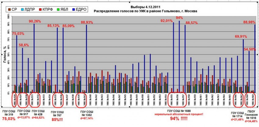 Похожая картина и с участками № 1698, 956, 955 и 931. На прошлых выборах «Единая Россия» смогла получить на этих участках обычные 51-58%, но в этот раз результат там превзошел 90%. «Ведомостям» вчера не удалось выяснить, что именно случилось на этих участках. Гигантские показатели голосования за «Единую Россию» в Москве просто невозможны, утверждает Кынев. Столица — гомогенный город, здесь нет национальных или социальных анклавов, поэтому и радикальной разницы в голосовании разных районов города, а уж тем более на участках, расположенных рядом, по его мнению, быть не может. Источник «Ведомостей», близкий к избирательному штабу «Единой России», признается, что гигантский результат «Единой России» на части московских участков связан с прямым «рисованием цифр». Об этом косвенно свидетельствует тот факт, что с 18.00 по 20.00 явка в Москве выросла с 50 до 60%.