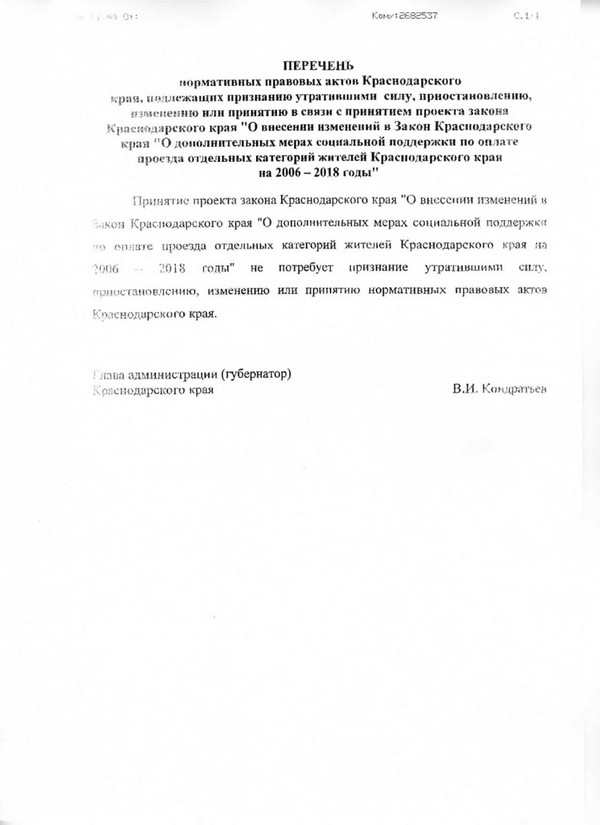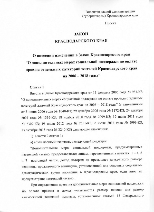 В соответствии с пунктом 4 статьи 32 Устава Краснодарского края и подпунктом 5 пункта 3 раздела VI Методических правил подготовки и оформления правовых актов, принимаемых Законодательным Собранием Краснодарского края, которые утверждены постановлением Законодательного Собрания Краснодарского края от 18 апреля 2012 года № 3212-П, направляю в Ваш адрес для дачи заключения проект закона Краснодарского края «О внесении изменений в Закон Краснодарского края «О дополнительных мерах социальной поддержки по оплате проезда отдельных категорий жителей Краснодарского края на 2006 — 2018 годы».