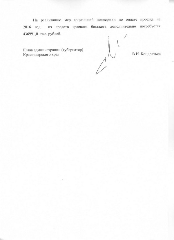 Даже несмотря на сложное финансовое положение и напряженный бюджет Краснодарского края на 2016 год, вполне возможно изыскание необходимых средств для реализации льгот по проезду в полном объеме. И прежде всего — за счет экономии на общегосударственных расходах, включая обслуживание администрации и госзакупки.