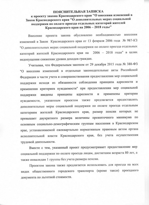 Из Пояснительной записки к законопроекту С.П.Обухова «О внесении изменений в Закон Краснодарского края «О дополнительных мерах социальной поддержки по оплате проезда отдельных категорий жителей Краснодарского края на 2006 — 2018 годы»