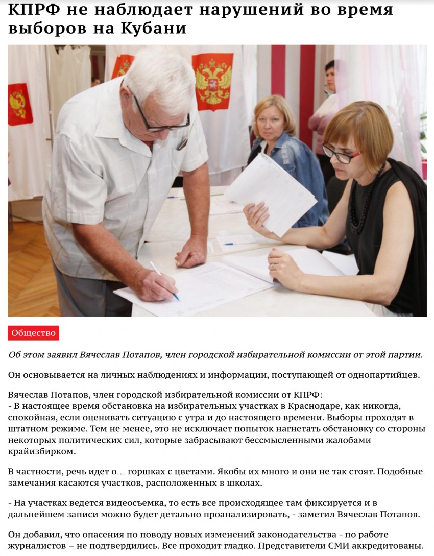Листала тут ленту новостей и наткнулась на статью. КПРФ не наблюдает нарушений во время выборов на Кубани. Свершилось, демократия пришла! У нас наконец-то даже коммунисты довольны ходом выборов.