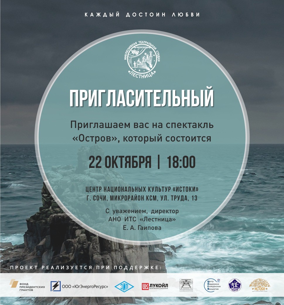 22 октября 2021 в 18.00 инклюзивная театральная студия «Лестница» (г. Краснодар) представит на сцене Центра национальных культур «ИСТОКИ» (г. Сочи) спектакль «Остров» по пьесе Мартина Макдонаха «Калека с острова Инишмаан»