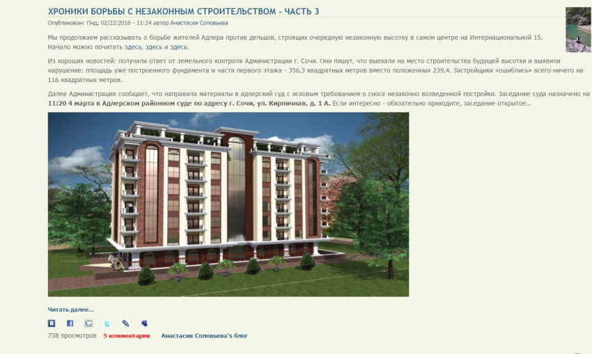 Мы продолжаем рассказывать о борьбе жителей Адлера против дельцов, строящих очередную незаконную высотку в самом центре на Интернациональной 15.