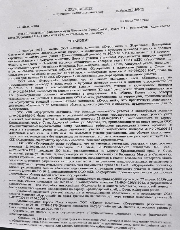 Согласно плану, на участке должны были появиться 50 трёхэтажных домов на 1,5 тысячи квартир. Но уже через год здесь выросли и 4-х и даже 6-ти этажные дома. Чтобы устранить выявленные нарушения, администрация Сочи обратилась с иском к ООО «ЖК «Курортный» о сносе самоволок. Суд арестовал эти объекты, а застройщику было запрещено совершать здесь все регистрационные действия. Об этом были информированы все заинтересованные субъекты. Кроме того застройщик о сложившейся ситуации обязан был довести информацию до дольщиков лично.
