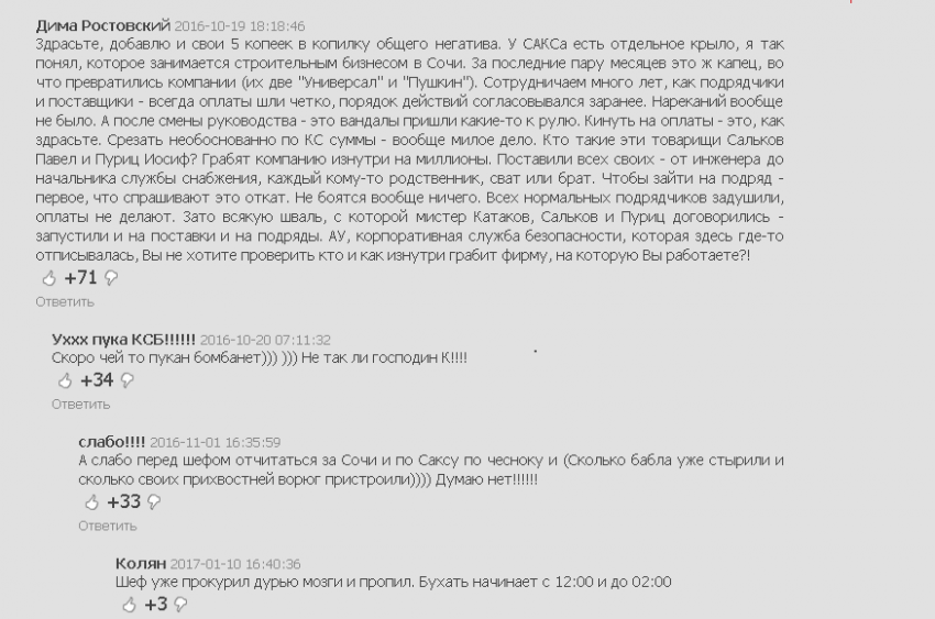 Касательно бывшего директора. Все воруют на стройке, это норма. «На работе ты не гость — утащила домой хоть гвоздь...» Но кто-то мер не знает. И да, у него не одна квартира в ЖК. Что меня еще больше успокаивает.