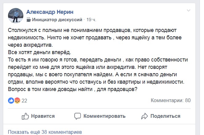 Столкнулся с полным не пониманием продавцов, которые продают недвижимость. Никто не хочет продавать, через ящейку а тем более через аккредитив.