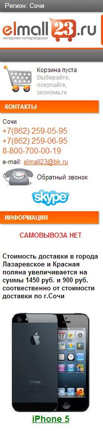 В магазине elmall23.ru более 100 000 товаров. В нашем магазине вы найдете любой интересующий вас товар от покрышек до Apple Iphone. Наши менеджеры всегда готовы проконсультировать вас по любому удобному для вас способу связи: Телефон, Skype, email, также вы можете заказать обратный звонок и менеджер сам перезвонит вам для уточнения деталей заказа.