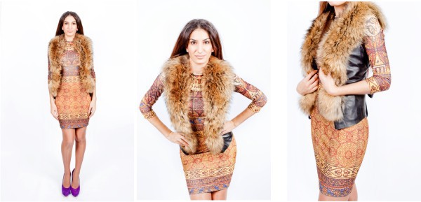 Платье «Мозаика» — 3199 руб. Жилет кожаный мех енот — 11699 руб. Колье — 1199 руб.
