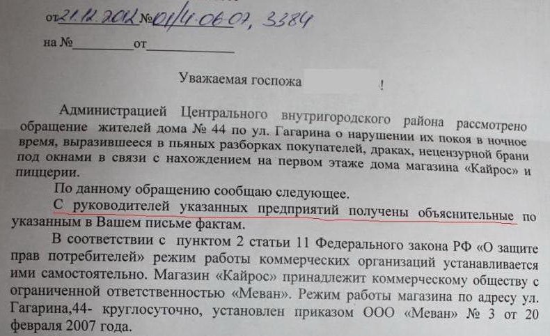 Письмо к нам в руки попало 05.01.2013. и как по заказу в ночь с 05.01 на 06.01 жителей дома 44 по ул. Гагарина ждало очередное ШОУ (Цирк дю солей отдыхает). Начиналось все как обычно: примерно с 24:00, около десятка бравых ребятишек, припарковав свои автомобили прямо на тротуаре, расположились около входа этого скромного магазинчика — «ни в чем себе не отказывали», все — «братаны», напитки, всякие разные, музыка и понеслось … «братан, я тебе отвечаю… я твою маму… чЁ ты сказал… и т.д. и т.п.».