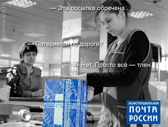 Иду сегодня на почту получать посылку. Обычный понедельник, послеобеденное время. С собой пара сникерсов, чай в термосе, полностью заряженный сотовый телефон с интернетом и фильмами, книжка, наушники, запас питьевой воды. Всё как обычно. Захожу, а очереди нет.Стоит одна девушка и всё. Я протёр глаза, уточнил у неё почта ли это, работает ли она, не воскресенье ли сегодня, и всё ли тут в порядке. Окинул взглядом зал на предмет скрытых камер. Получил свою посылку за полторы минуты и ушёл. Бред какой-то.