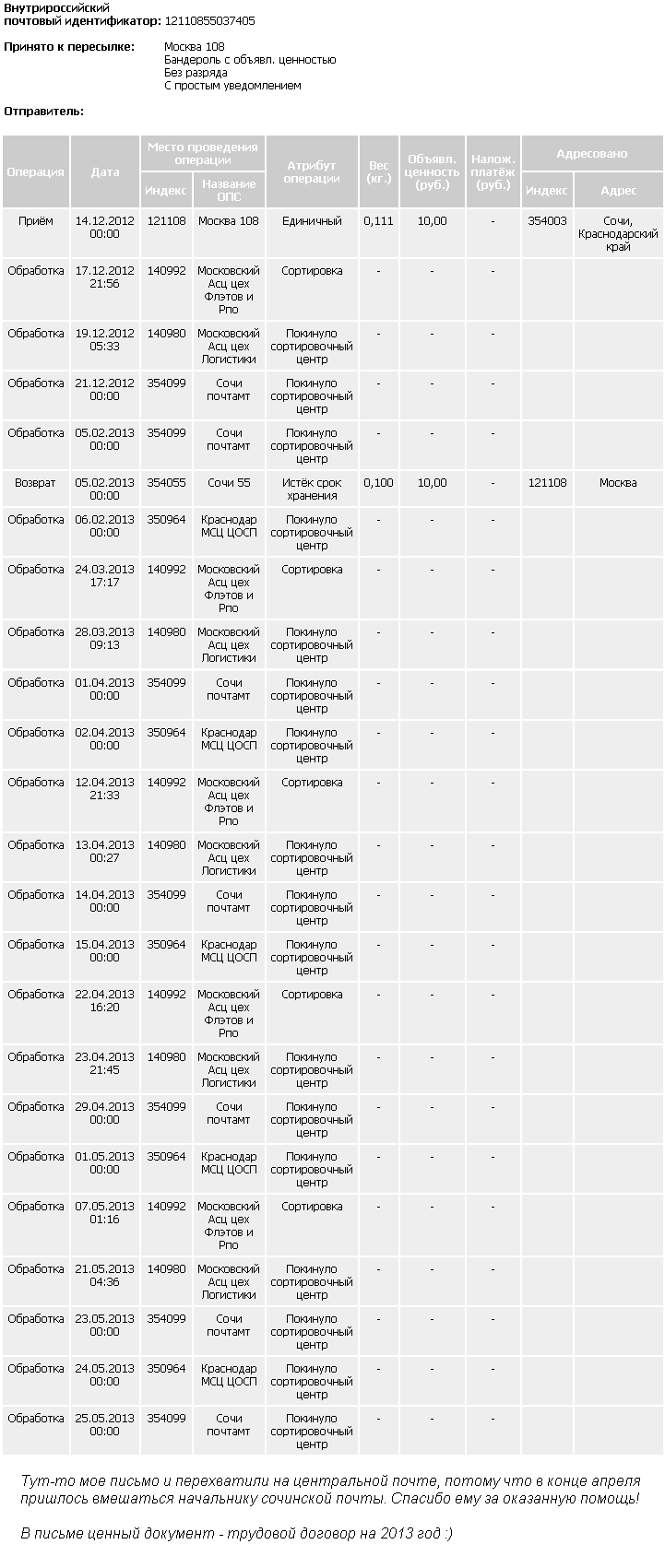 Напрашивается вывод, что сбои в подобной работе (а может и всей «Почты России» в целом?) возникают из-за того, что кому-то не хочется утруждать себя выполнением должностных обязанностей. И поэтому посылки перемещаются по Сочи черепашьим ходом, а при перевозке из одного города в другой, бывает, теряются и т.д. Так и живем…