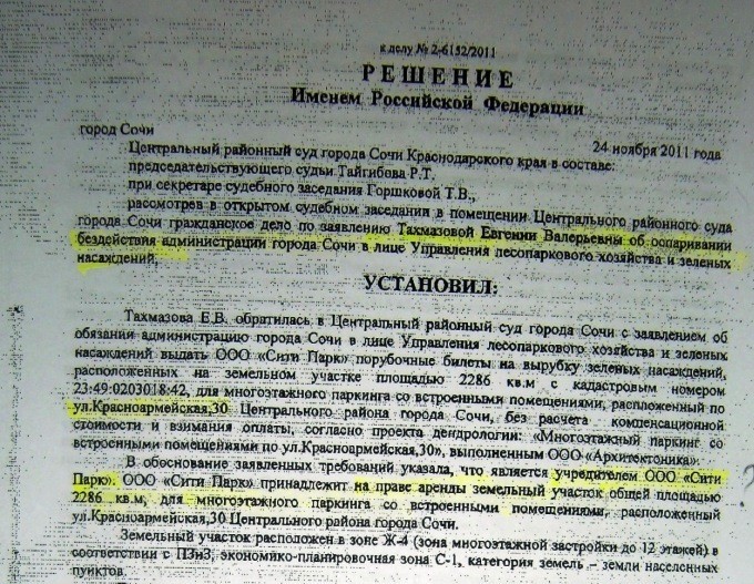 Оказалось, что на то есть разрешение № 009984, выданное Управлением по охране окружающей среды и лесопарковому хозяйству администрации города Сочи 22 декабря 2011 года, в нём все деревья под снос и пересадку перечислены поштучно. Разрешение выдано ООО «Сити Парк».