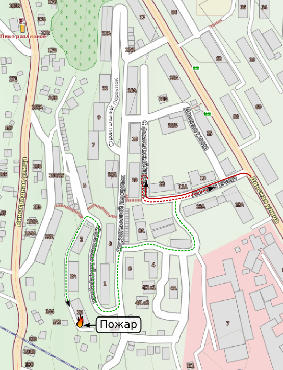 Красной линией обозначен первоначальный заезд пожарной машины (и пунктиром их отъезд), зелёной — то, куда им надо было спешить:.