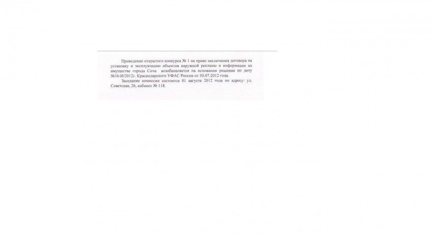 29 июня 2012г на сайте администрации объявлено о проведении открытого конкурса на право заключения договора на установку и эксплуатацию объектов наружной рекламы и информации на имуществе города Сочи (новая редакция).