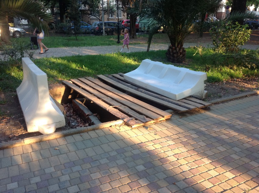 Если прогуляться по набережной реки Сочи со стороны улицы Конституции СССР, там где спокойно доживают свой короткий век лавровишни, так и не представ перед нами в своем тропическом наряде и лишь изредка позволяющие работникам зеленстроя обстригать с себя так быстро желтеющие листья, можно заметить странные слегка прикрытые ямы повторяющиеся каждые десять метров от Кубанского кольца до пешеходного моста на Ривьеру.