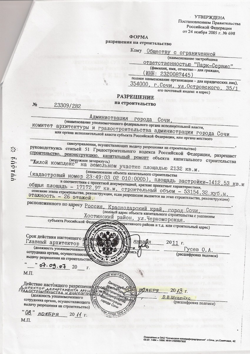 Давайте посмотрим — действие разрешения на строительство было выдано застройщику в 2007 году и срок его действия заканчивался в 2011 году в январе месяце.