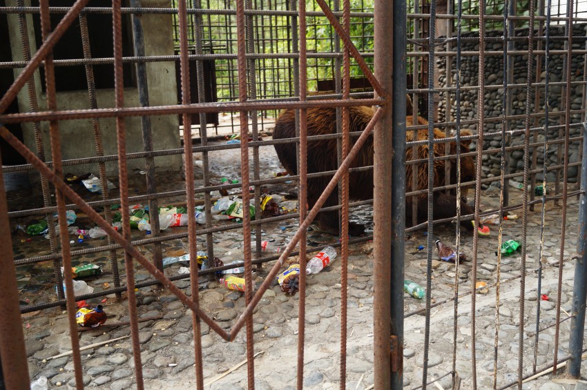 Сегодня сьездила к медведям на Мацесте. Картина просто душераздирающая, без слез на них посмотришь… Несколько раз уже на Привете этих медведей обсуждали, но ничего не меняется в условиях жизни мишек. Сейчас стоит невыносимая жара, а у медведей все так же нет чистой воды в вольере им просто попить нечего… Там где должна быть вода, там плавает грязная жижа с мусором которая уже незнаю сколько не менялась, не вода, а помои…… В клетках кучи мусора, пластиковых бутылок от пива и газировки, упаковок от чипсов и т.д. Вереницами к медведям едет молодежь с баклажками пива и чипсами, кидают их в клетку и смотрят на зрелище как мишки раскусывают бутылку и выпивают пиво. Я подошла к работнику ресторана и спросила, почему вы им не нальете воды хоть, на что он сказал что воды для них сейчас нету у них, после чего быстро сел в машину и уехал…