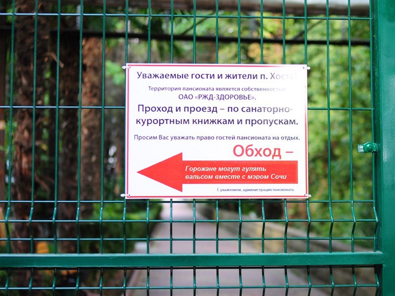 Прогуливаясь сегодня с детьми по привычному маршруту набережной Хосты была неприятно удивлена появившимся практически блок постом. Табличка оповещала уважаемых гостей и жителей Хосты о том, что это собственность ОАО «РЖД-здоровье» и отныне мы должны уважать право гостей данного пансионата на отдых...