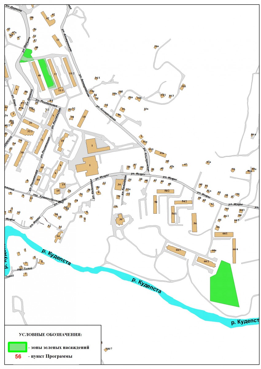 11. Хоста: ул.Дарвина, у дома 46, у ЦТП, у домов 89 — 91, ул. Апшеронская, 18 школа, сквер учителей: деревьев — 80шт, кустарников — 400шт