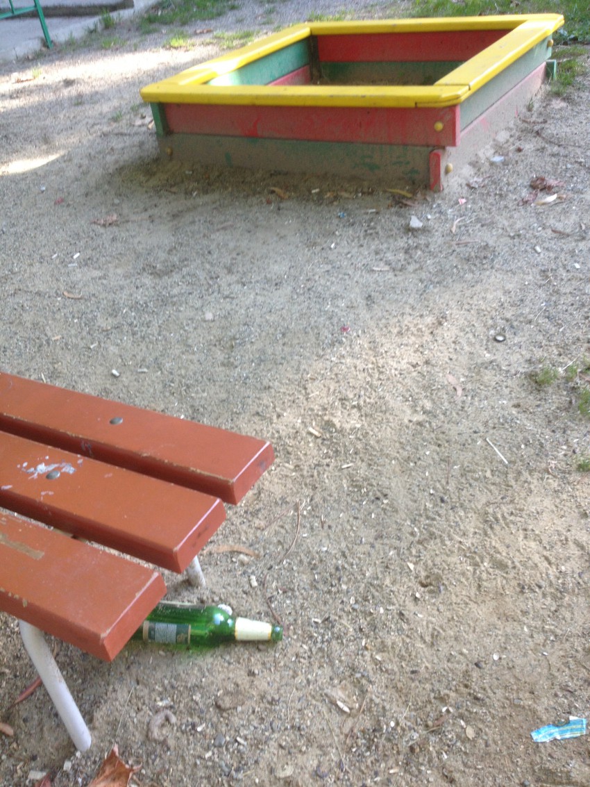 На детских площадках и вокруг них тоже все печально, поросло травой, тысячи окурков, разбитые бутылки в земле.