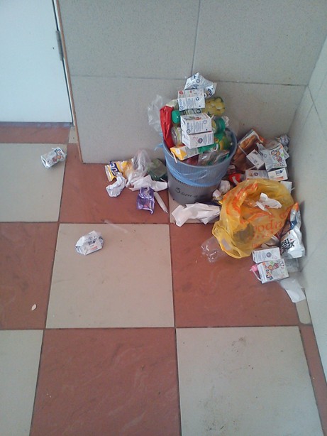 На днях была в школе. Началась перемена, а после перемены на полу осталось всё, что употребили дети во время перемены. А когда раздали молоко, то пакеты валялись уже не только в школе, но и на улице. А само молоко лилось рекой по полу и асфальту.