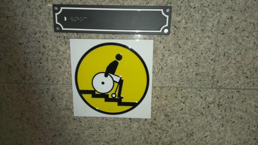 второе, табличка возле двери. Значит в хозяйственном магазине, с одной ступенькой с улицы, предприниматель должен сделать пандус, а на вокзале табличкой инвалидам пожелали счастливого пути по ступенькам.