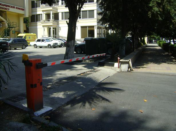 Ещё один гарант безопасности и элемент благоустройства — шлагбаум. Их как-то густо… И все поперёк тротуаров. Вот «Армедовский», но тут по-старинке, въезд как въезд — с асфальтом.