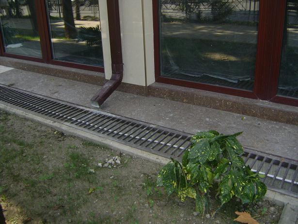 По всему периметру здания (напоминаю, что он почти равен периметру участка) расположены ливнёвочки. Это с нашей стороны — аккурат за забором: