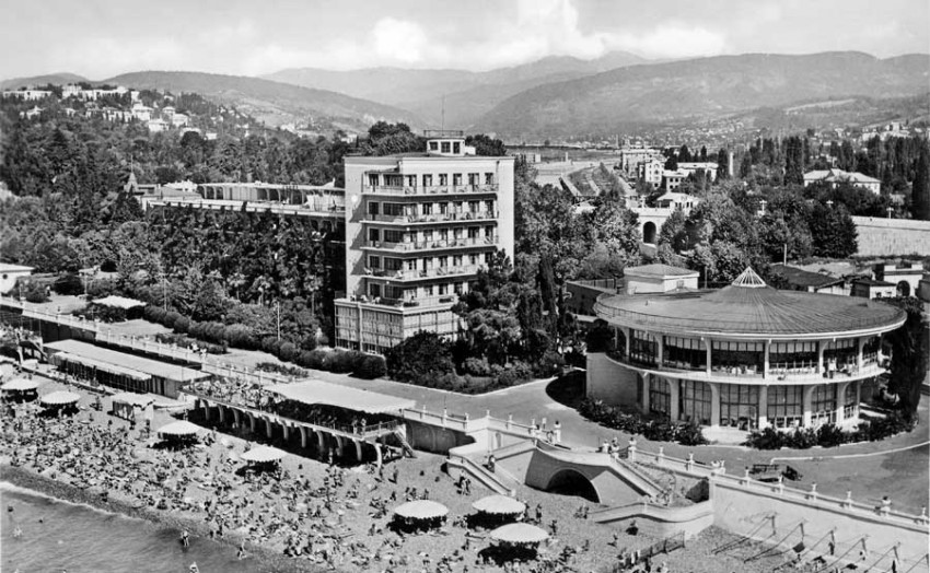 В круглом здании был ресторан на крыше и столовая внизу… идешь на море, а запах так и манит… ням) А по лестнице к морю спрыгивали… путь сократить. Эх детство!