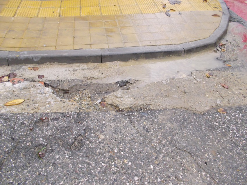 Поскольку хожу я сейчас с коляской, то уже на подходе к переходу возникли трудности — добраться до брусчаточки можно только преодолев привычную для сегодняшнего Сочи размытую канаву в асфальте.