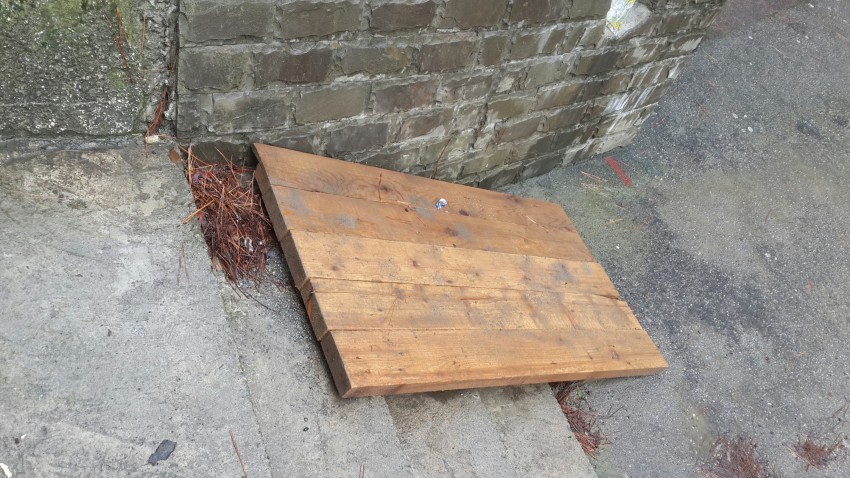 И пока его строят, заботливо предоставили временный, деревянный. На ступеньку короче, чем надо, конечно…