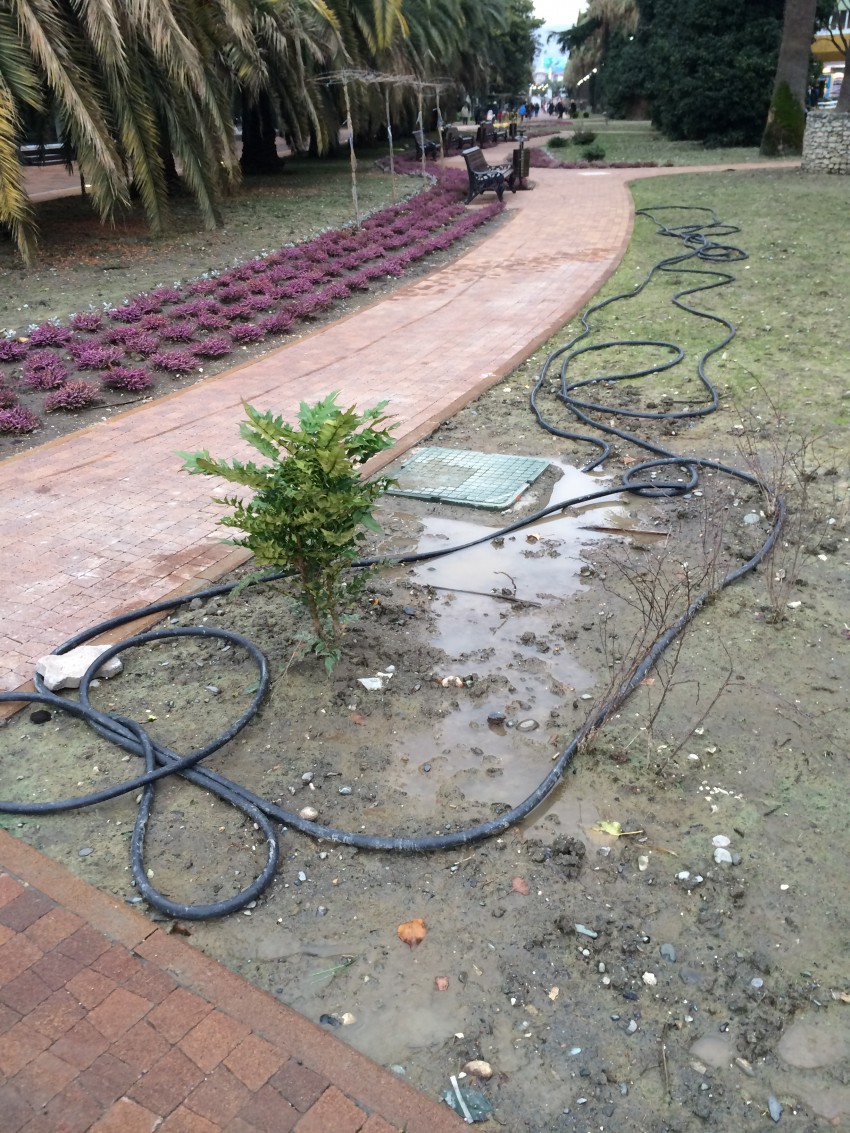 Самый идиотизм прокладки плитки виден на первой фотке. Каким идиотом, в прямом смысле слова, нужно быть, чтобы проложить дорожку посредине пальмы. Это однозначно народ пойдет по клумбам чтобы ее обойти. Там по клумбам пройдет, сям напрямик прорежет — вот тебе и тропинки появятся в пешеходной зоне.