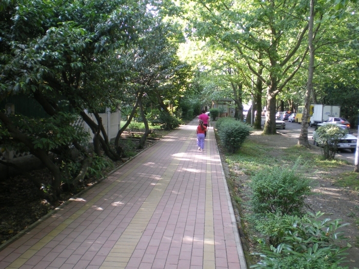 при увеличении хорошо виден зелёный жилой микрорайон, прекрасные платановая и кипарисовые аллеи. Видно, как жилые дома отделены от территории товарного двора и ЖБИ (там сейчас полный пустырь)минимум 8 рядами зеленых посадок.