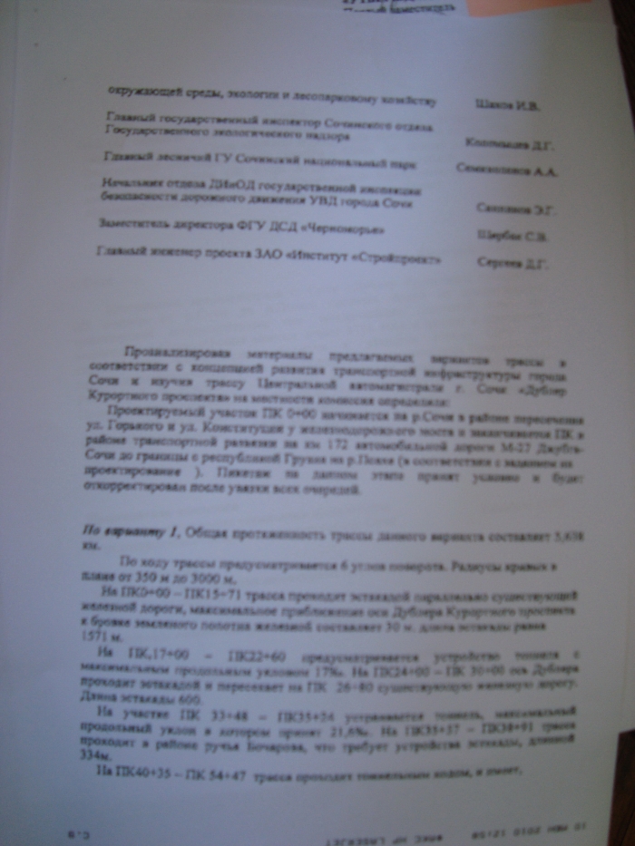 2) нигде не говорится, что нарушаются требования СНиП и санитарных норм, которые требуют прокладывать такие трассы за пределами жилых кварталов города, нигде не говорится, что эстакада пройдет над головами жителей курорта Сочи. Такие недостатки комиссия «НЕ УВИДЕЛА». Она наоборот, предлагает ЕЩЕ БОЛЬШЕ СПРЯМИТЬ трассу, прокладывая ее по жилым кварталам в угоду дорожникам. То, что рядом, севернее железной дороги дорогу можно проложить не задевая жилые дома, комиссия и проектировщики не увидели или не захотели увидеть: -А люди что?
