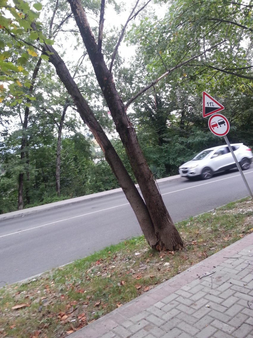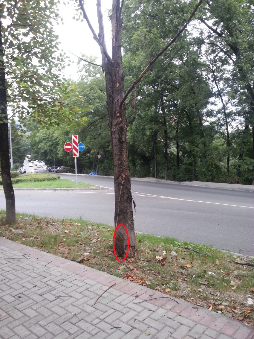 Уважаемые граждане, сто раз поднимался на Привете вопрос о сносе трухлявых и опасных деревьев, но я так и не нашёл куда же звонить, а товарищ мне скинул фото — место действия верх Макаренко (от «треугольника» в сторону ул. Вишнёвой).