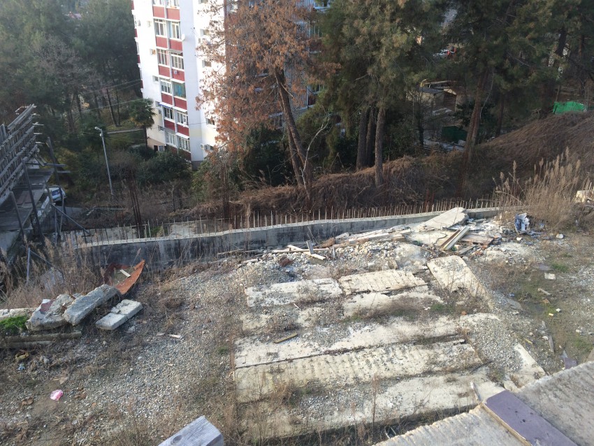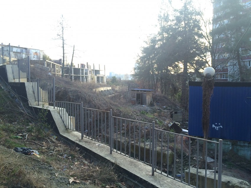 При начале строительства, лестничный сход идущий от дома по ул. Чехова 58, частично разломали — лестница мешала подъезду грузовых машин к стройке, а потом там сделали подпорную стену