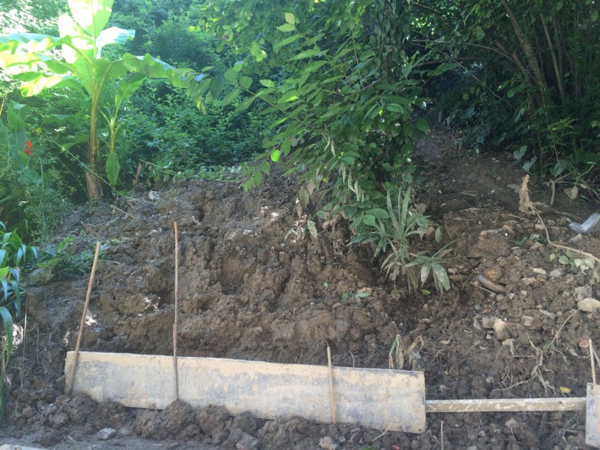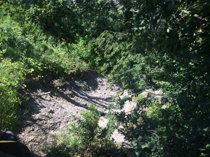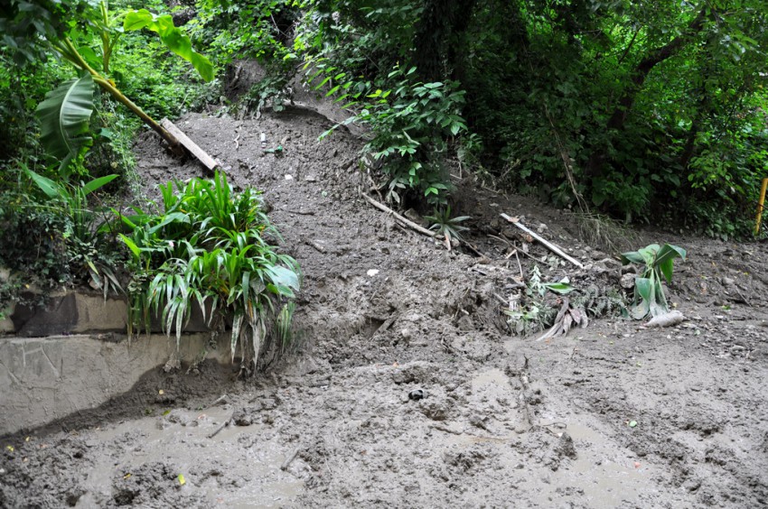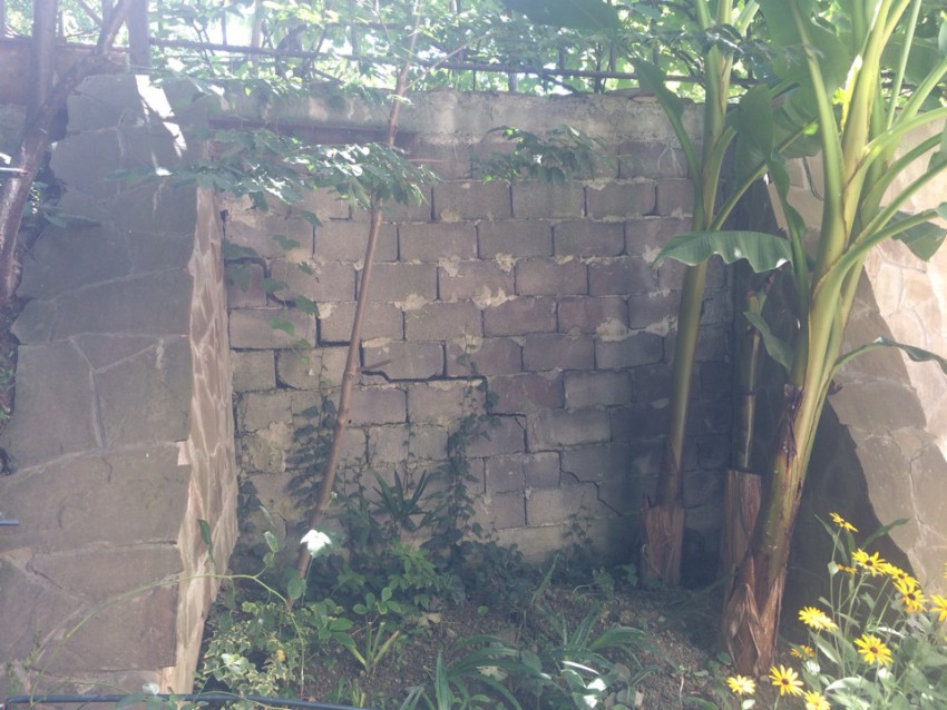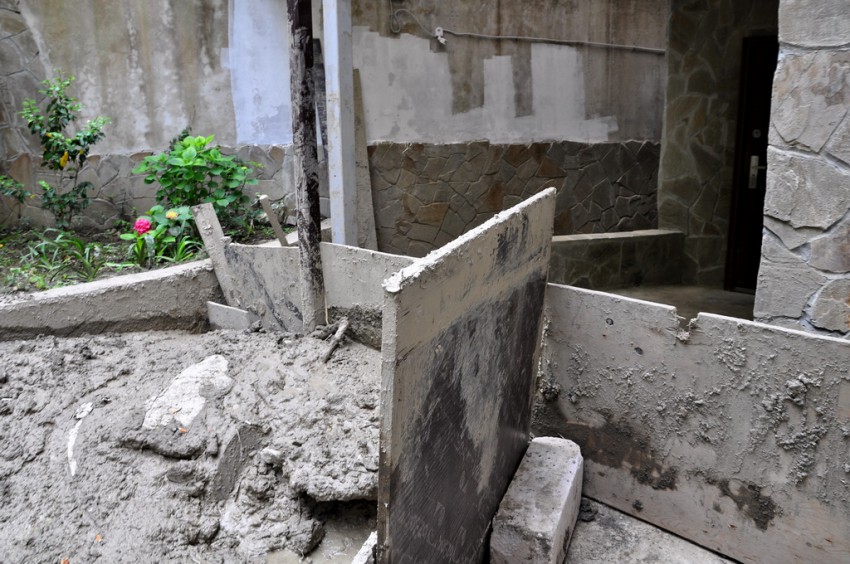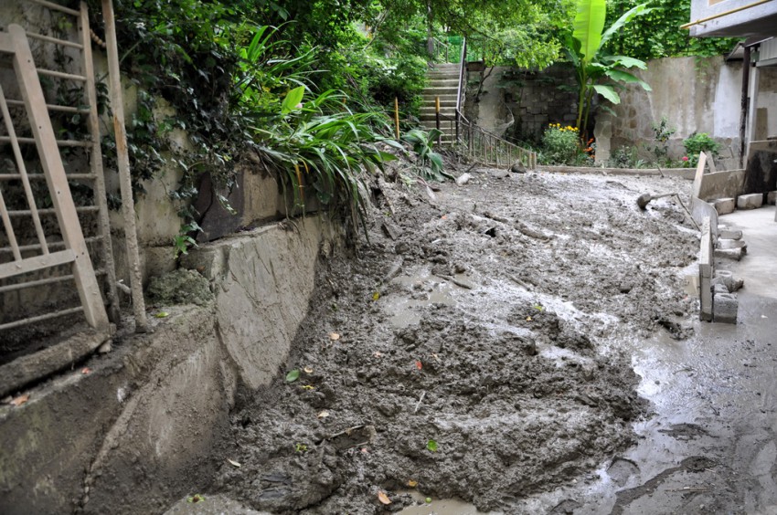 Этот дом, последний в ряду, за ним находится ничем не укреплённый оползневый склон. Хорошо ещё, что дом стоит не вплотную, есть небольшая, скорее декоративная, стенка и какие-никакие ливнёвки: узенькие и совсем не глубокие. Во время часа Х склон пришёл в движение и на придомовую территорию рухнула огромная лавина из воды, грунта и камней…