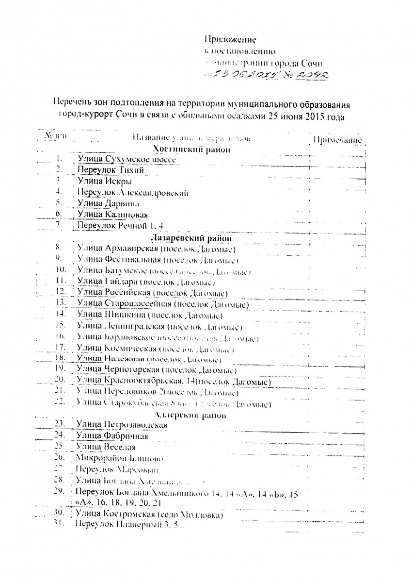 Что касается Сочи, то определение зон подтопления может базироваться на недавних событиях, случившихся в городе в конце июня прошлого года. Все места были перечислены в Постановлении администрации города Сочи № 2042 от 29.06.2015, в котором ул. Старошоссейная (а именно на ней находится Дагомысская мебельная фабрика) значится в п. 13 в перечне зон подтопления.