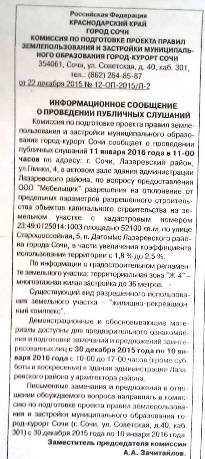 Утро первого рабочего для нового года принесло неожиданную новость: в 11:00 в здании администрации Лазаревского района состоятся публичные слушания по изменению КИТ жилой застройки участка бывшей мебельной фабрики в Дагомысе. Как-то сильно непоследовательно выглядело сначала настойчивое со стороны главы города принятие коэффициентов использовании территории в ПЗЗ, и вот спустя всего несколько месяцев проведение публичных слушаний по изменению ограничительных значений КИТ и скорее всего в пользу застройщика.