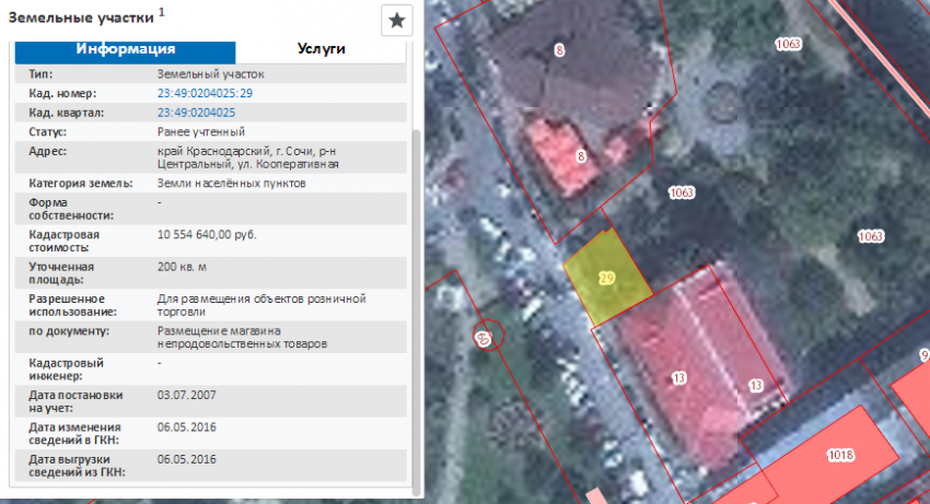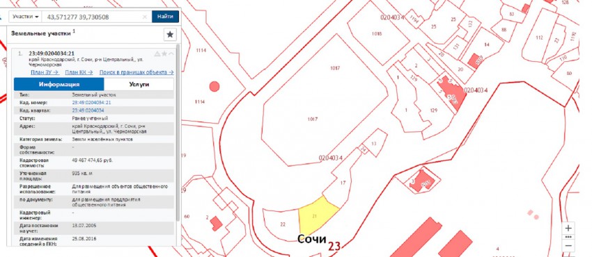 Участок номер два расположен рядом, далеко ходить не нужно. Кадастровый номер 23:49:0204034:21. Тут всё просто: назначение участка — для размещения объектов общественного питания… Вот так просто и незатейливо…