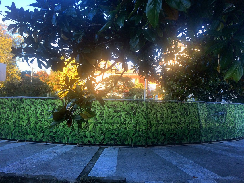 Слов нет, такого совершенно иезуитского описания зелёной зоны видеть ещё не приходилось. Интересно, когда уже столь непрофессиональной деятельности кадастровых инженеров прокуратура города будет давать правовую оценку? По факту — это прекрасная зелёная зона с кустами олеандров и огромными эвкалиптами, кстати, в правилах землепользования и застройки так и написано: зелёная зона… Правда, среди кустов, как рояли, торчат сразу ТРИ(!!!) панно с цветами, от стыда спрятали что ли…