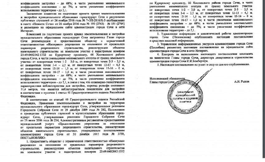 И вот перед самым новым годом администрация выносит: постановление администрации города Сочи от 15.12.2016 № 2852 «О предоставлении разрешения на отклонение от предельных параметров разрешенного строительства, реконструкции объектов капитального строительства на земельном участке с кадастровым номером 23:49:0302008:72 по Курортному проспекту, 66 Хостинского района города Сочи»