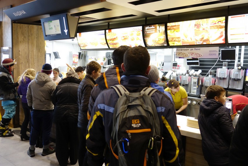 А вот народ стоит за ски-пассами. Ничего особенного, за пять минут такое легко рассасывается. А если купить ски-пассы заранее, то их можно без очереди взять в инфоцентре. Или со скидкой приобрести на ресепшн своего отеля. Дарю вам этот лайфхак.