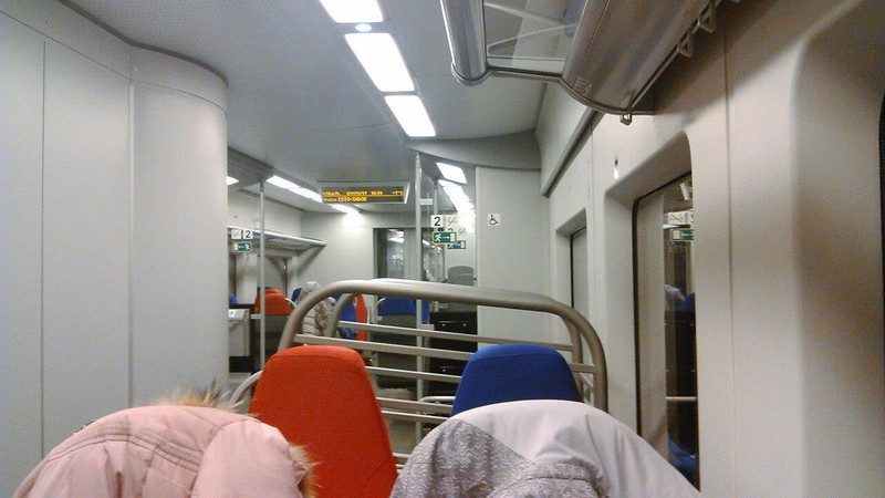 Долго ли коротко ли, поехали мы отмечать Новый год в Горки Город, на три дня. Почему так вышло — расскажу отдельно, здесь это значения не имеет. Сели мы 30 декабря в дневную Ласточку, которая отбывает от главного ж/д вокзала в 13:46. За билеты заплатили по 434 рубля с человека и ещё 56 рублей отдали за живность. Поезд на 6-й путь подали не обычный, из пяти вагонов, а из двух составов — т.е. десять вагонов сразу. Мы разместились в первом вагоне второго состава, в середине поезда, как раз напротив выхода из подземного перехода. 20 минут до отправления поезда… кроме нас с котом в вагоне больше никого, и даже в соседнем людей не видно.