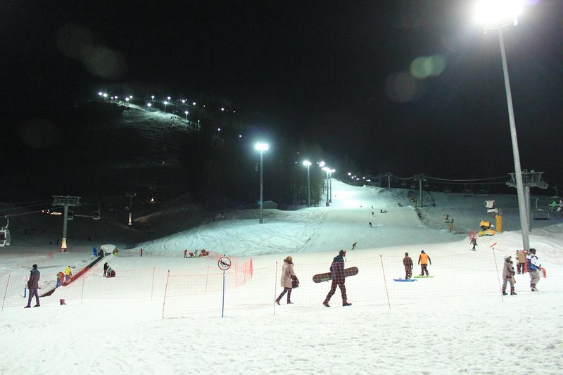 Мне сейчас скажут: а все на горнолыжных склонах! Ну-ну. Вот вам склон. Вечернее катание действует с шести до одиннадцати вечера, открыта единственная синяя трасса с уровня 1460 до уровня 960. Это фото сделано около восьми часов. Ребята, вы реально видите на спуске толпу народа? Серьёзно? Я замечу, что мне потребовалось несколько минут стоять и ждать, когда наконец появятся люди — у меня есть кадры с идеально белой пустой трассой.