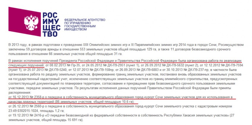 В 2012 году таким же образом городу-курорту Сочи тоже были переданы земельные участки для использования их в качестве пляжных территорий (ДК-П9-2951 от 24.05.2012)