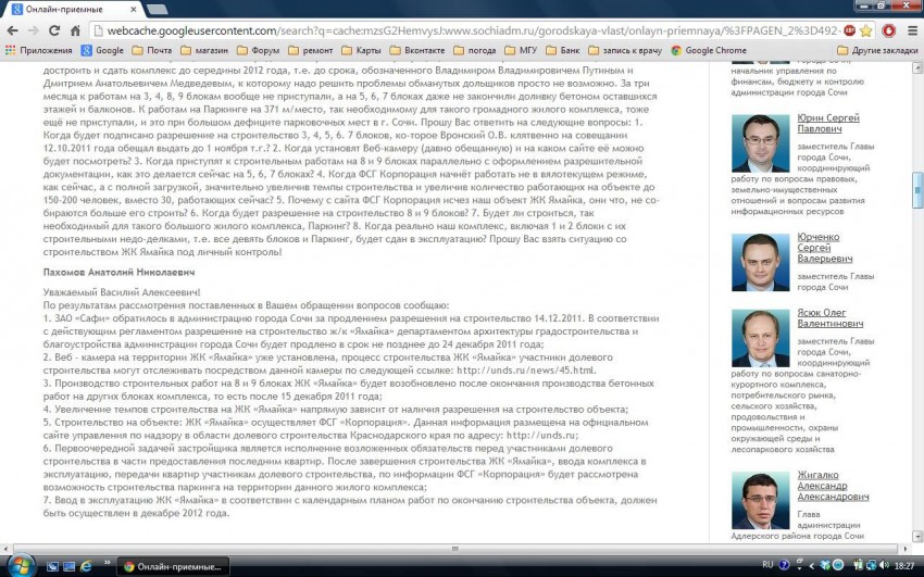 По поручению президента РФ, регионы обязаны были закрыть тему обманутых дольщиков до конца 2012 г. Поручение не выполнено. По поручению президента № 2820 п.2, правительство РФ совместно с органами исполнительной власти субъектов РФ до 1 февраля 2013 г должны были провести инвентаризацию всех «проблемных» объектов, утвердить планы-графики проведения мероприятий по решению проблем пострадавших граждан, определив объемы и источники финансирования. Это поручение президента также не выполнено! Очередное поручение президента регионам решить проблему дольщиков до 2018 г, в администрации г.Сочи всерьез не воспринимают и полностью игнорируют, считая, что к ним это не относится!