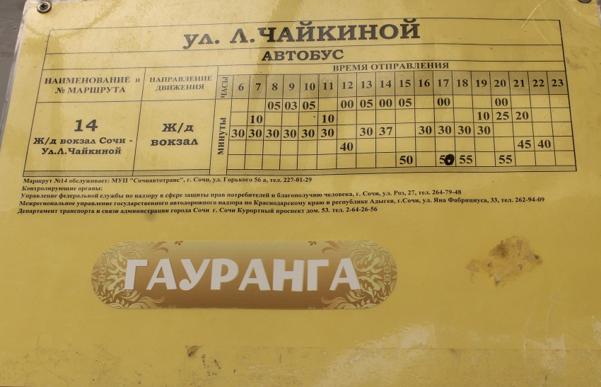 Расписание автобуса №14 весит со времён установки остановки. Рейс два раза в час, автобус так и ездит. Хотя население Соболевки выросло в три раза, но администрации города до этого дела нет. Сколько блогеры писали уже, а зам. главы Мугдин Чермит опирается на старые данные в своих ответах на письма ОГД«ПриветСочи». Из-за чего люди лишний раз не едут в поликлинику и по своим делам, потому что из-за перегрузки автобуса пешком не успевают дойти в город во время.